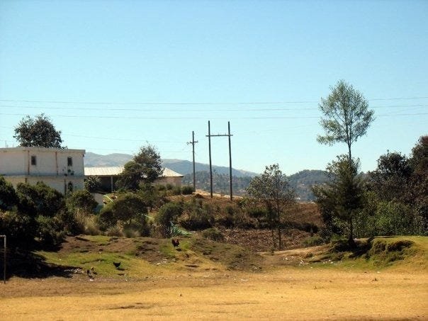 A local teacher had the keys and was happy to invite me inside. I saw where my bed had been. Our kitchen table. The patched hole from the lightning strike. It didn’t take long to see what there was to see. So I walked around back, to the rutty soccer field lined on the far side by eucalyptus trees. I looked up on the hill by the intersection that gave the village its name. There stood three utility poles.